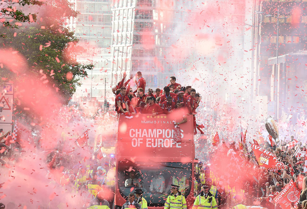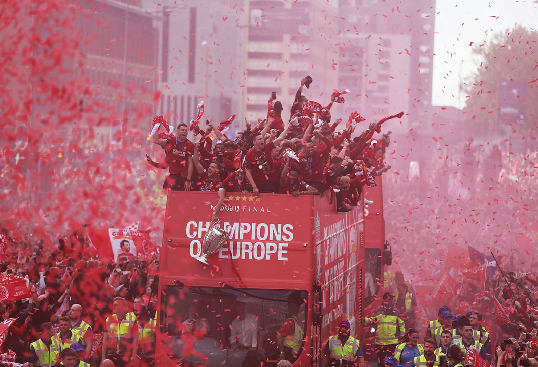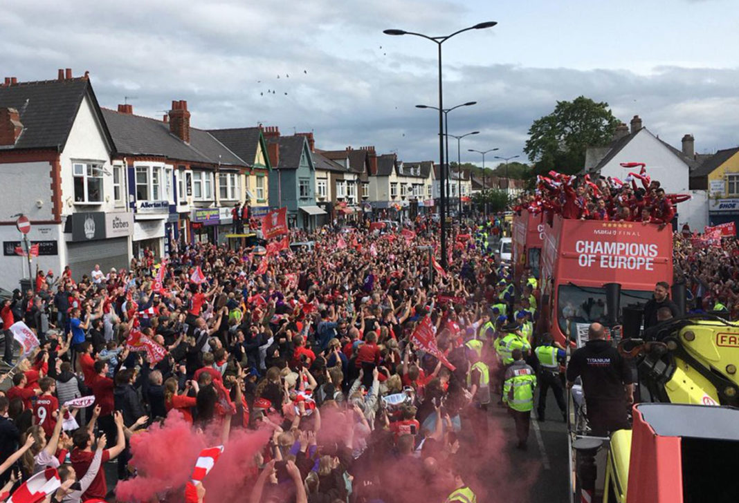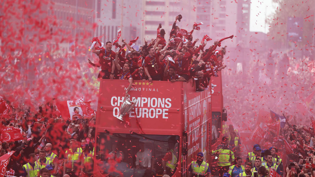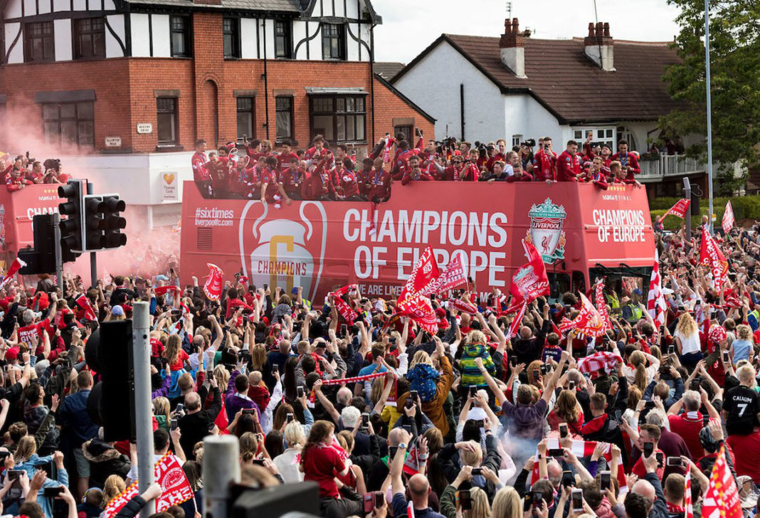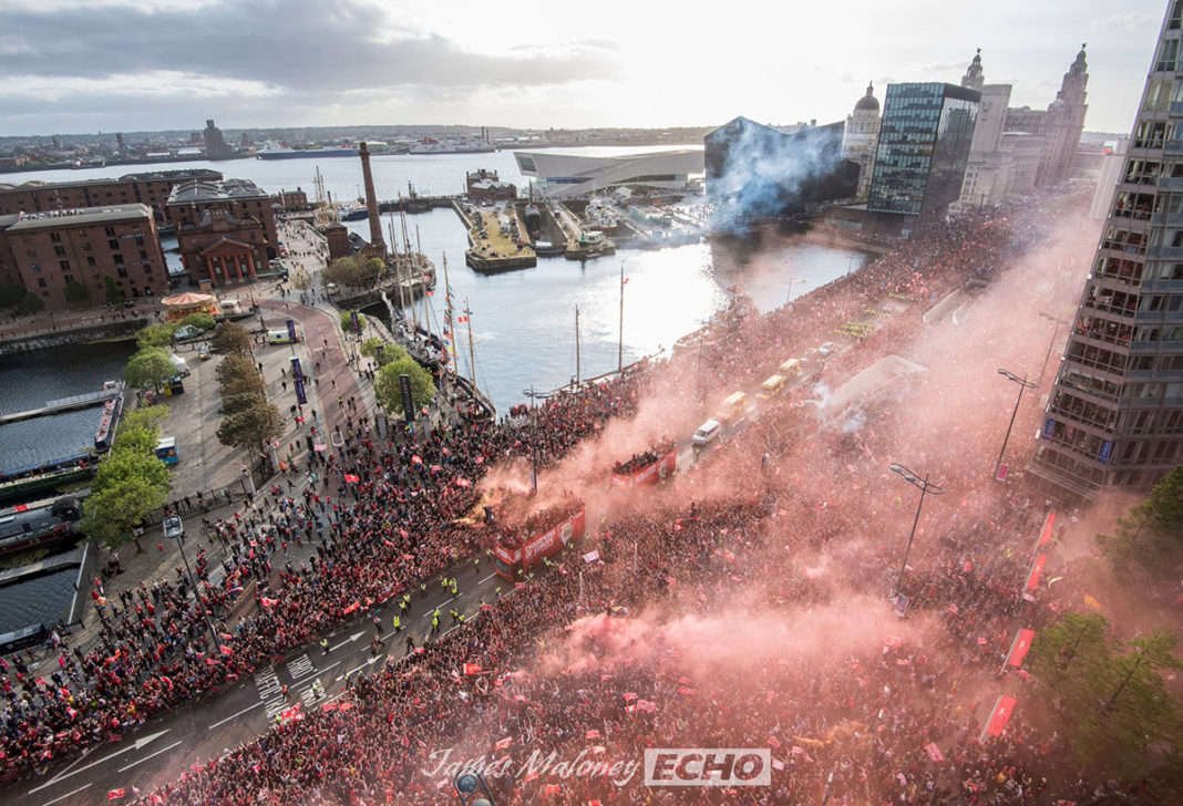 Ausgelassene Stimmung in Liverpool! Mit bis zu 750.000 Fans feierte die Mannschaft von Jürgen Klopp den 6. Champions-League-Triumph der Vereinsgeschichte. Ein rekordverdächtige Kulisse. Anders als noch die Istanbul-Parade im Jahr 2005 (Höhepunkt St. George’s Hall), führte die Bus-Route diesmal über die Waterfront Liverpools, wo auch der Höhepunkt der vierstündigen Feierlichkeiten seinen stattfand. Ein Feuerwerk an der Spitze Royal Liver Building empfing das Siegesteam gebührend. Der Hafen war selbstverständlich geschlossen. Der Siegeszug startete an Mather Avenue. Bürgermeister Joe Anderson twitterte eine Schätzung von 750.000 Menschen. THIS MEANS MORE!