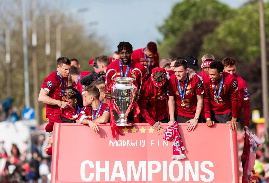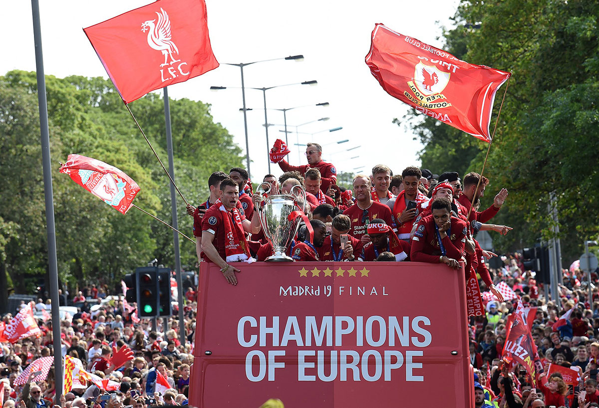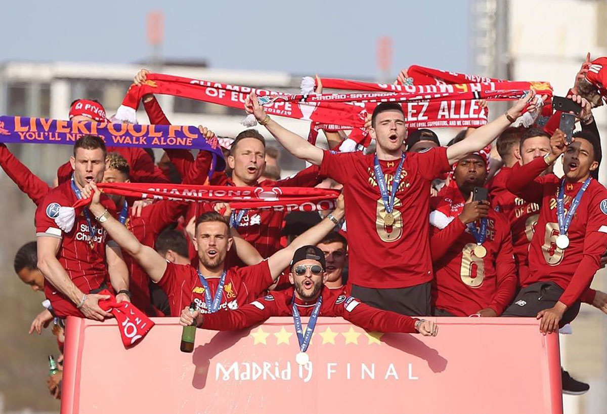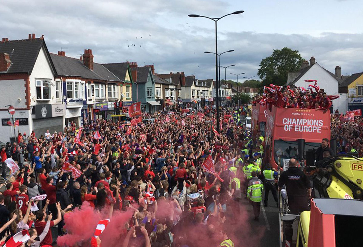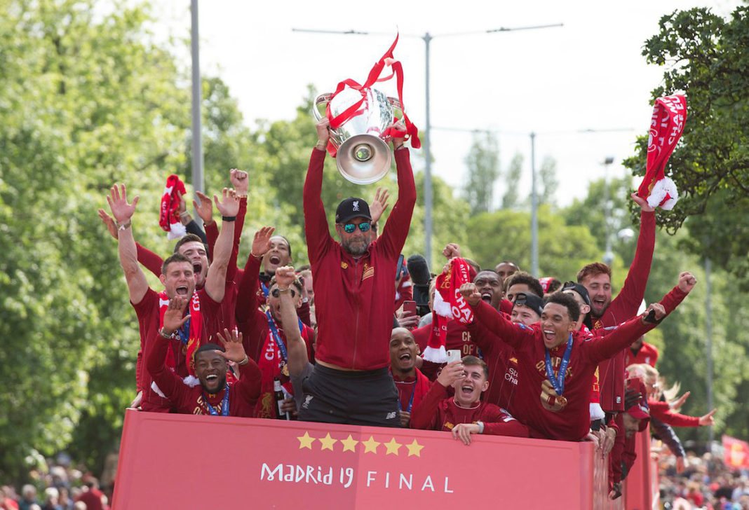 Ausgelassene Stimmung in Liverpool! Mit bis zu 750.000 Fans feierte die Mannschaft von Jürgen Klopp den 6. Champions-League-Triumph der Vereinsgeschichte. Ein rekordverdächtige Kulisse. Anders als noch die Istanbul-Parade im Jahr 2005 (Höhepunkt St. George’s Hall), führte die Bus-Route diesmal über die Waterfront Liverpools, wo auch der Höhepunkt der vierstündigen Feierlichkeiten seinen stattfand. Ein Feuerwerk an der Spitze Royal Liver Building empfing das Siegesteam gebührend. Der Hafen war selbstverständlich geschlossen. Der Siegeszug startete an Mather Avenue. Bürgermeister Joe Anderson twitterte eine Schätzung von 750.000 Menschen. THIS MEANS MORE!