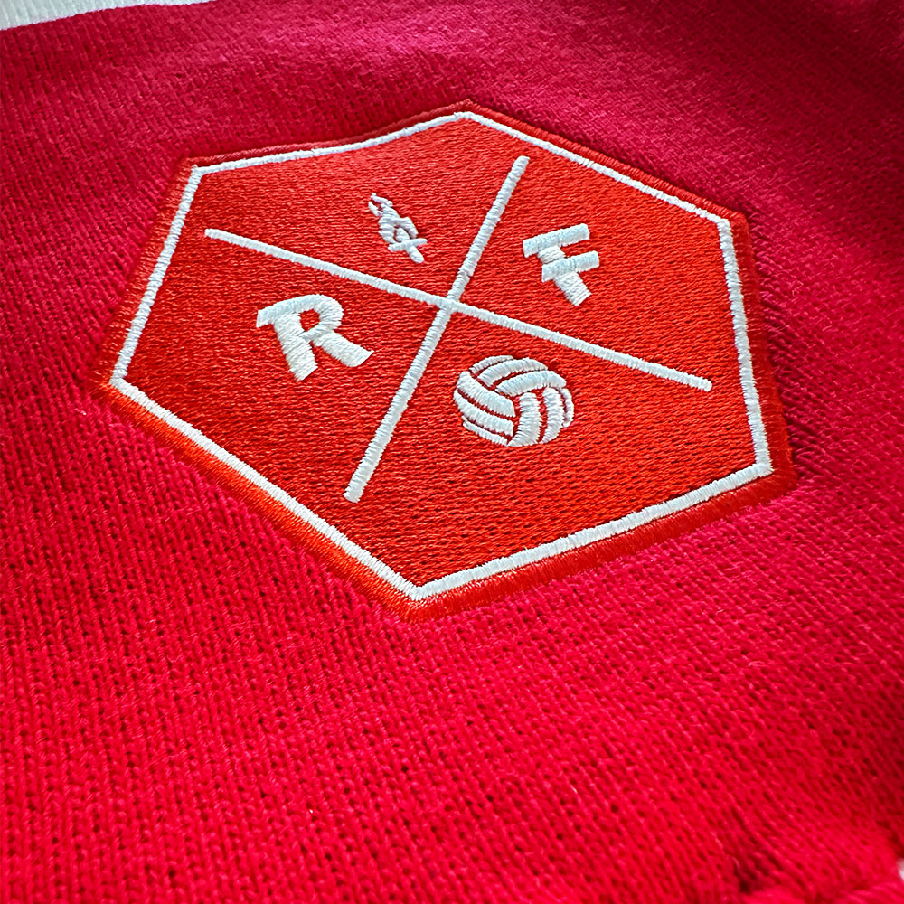 Zeitloser Balkenschal für Spieltage und klare Botschaften – gefertigt für Red Fellas Austria.